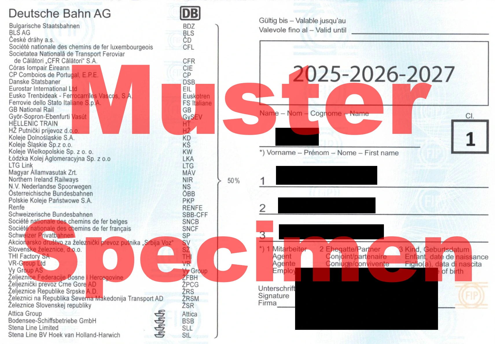 To use FIP discounts, you need a current FIP Card. It is always valid for a fixed period of three years. The current period is 2025-2026-2027. The FIP Card serves as proof of eligibility for FIP 50 Tickets. It is issued for either 1st or 2nd class. With a 1st class card, you can order FIP Coupons and buy FIP 50 Tickets for both 1st and 2nd class; with a 2nd class card, only for 2nd class. It can be ordered through the railway company you work for. The exact ordering process differs by company.